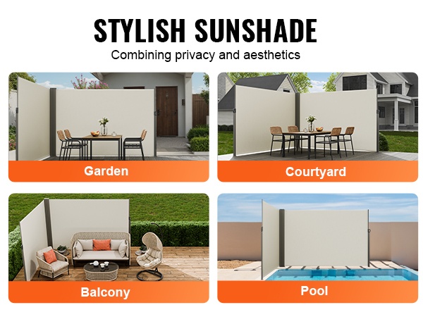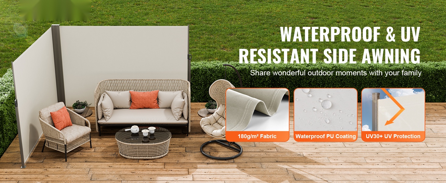Tämä vedettävä sivumarkiisi tuo suojaa ja rauhaa parvekkeelle, terassille tai pihalle. Se toimii tuuli- ja näkösuojana sekä antaa varjoa auringolta, joten ulkotilaa on mukavampi käyttää eri sääolosuhteissa.