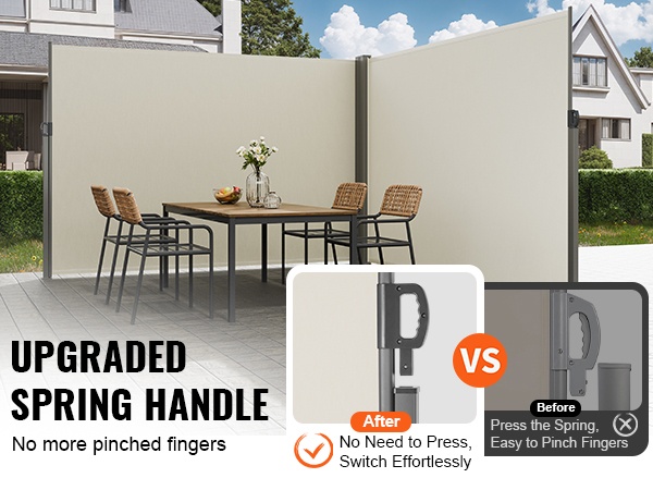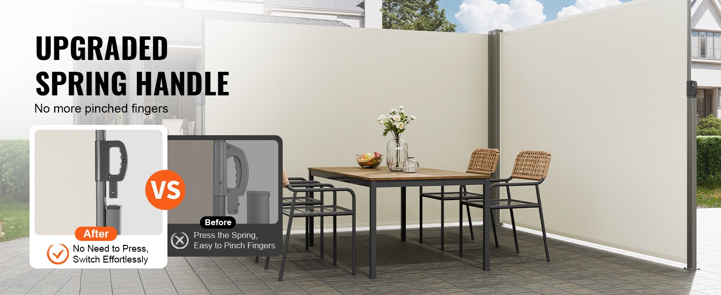 Vedettävä kahva ja jousimekanismi tekevät käytöstä sujuvaa. Verho liukuu kevyesti ulos ja sisään, joten varjon ja näkösuojan saa nopeasti käyttöön vain kevyellä vedolla.