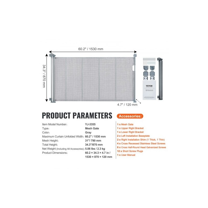 Vedettävä verkkoinen turvaportti korkeus 86,9 cm leveys jopa 152,4 cm harmaa sisäkäyttöön