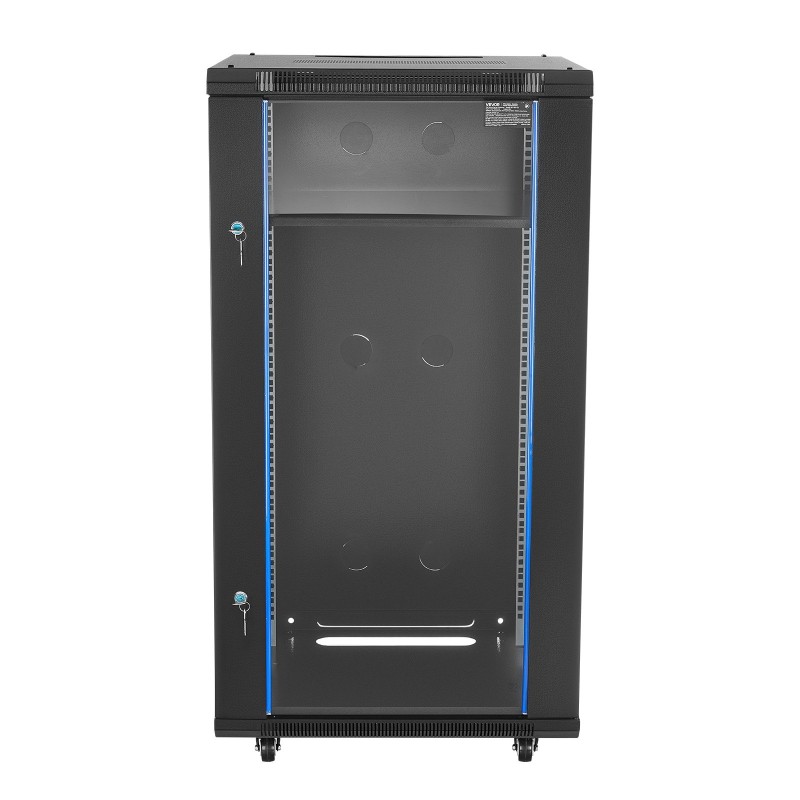 Kaappi on valmistettu lujasta Q235-hiiliteräksestä, mikä tekee siitä kestävän ja vakaasti kuormitettavan. Karkaistu lasiovi tarjoaa hyvän näkyvyyden laitteisiin avaamatta ovea. Useat kaapeliläpiviennit helpottavat johdotusta sekä ylhäältä että alhaalta, jolloin asennus pysyy siistinä ja ilmankierto vapaana.