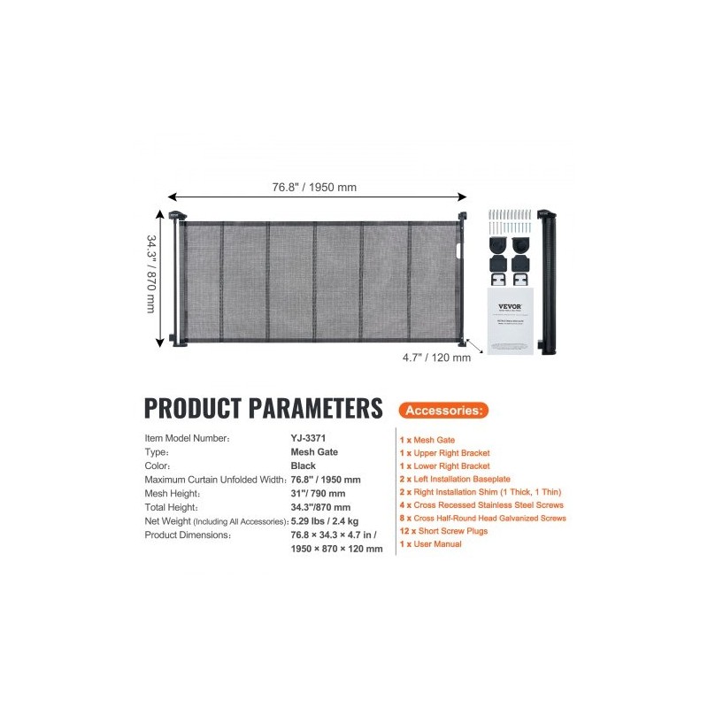 Tämä 86.9 cm korkea verkollinen turvaportti luo selkeän rajan lasten ja lemmikkien leikki- tai oleskelualueille. Portti ulottuu enintään 195.1 cm leveyteen, joten se sopii erilaisiin oviaukkoihin, käytäviin ja portaikkoihin kotiympäristössä.