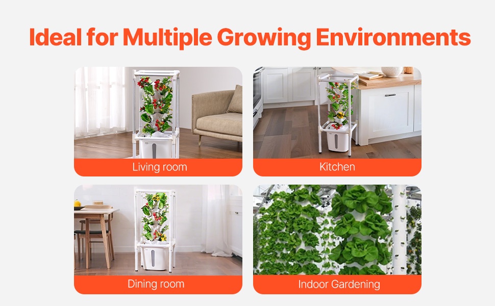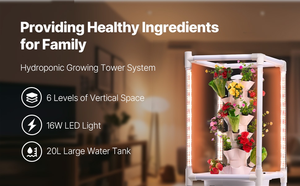 Tämä 6-kerroksinen pystysuora vesiviljelytorni on valmistettu PP-muovista ja sopii hyvin vihanneksille sekä kukille. 20L vesisäiliö ja kiertovesijärjestelmä tukevat kasvien tervettä kasvua. Älykkään ajastinpistorasian avulla voit ohjata helposti valojen ja vedenpumpun toiminta-aikoja. Järjestelmä on helppo ottaa käyttöön, toimii ilman multaa ja auttaa sinua luomaan siistin ja helppohoitoisen sisäpuutarhan.
