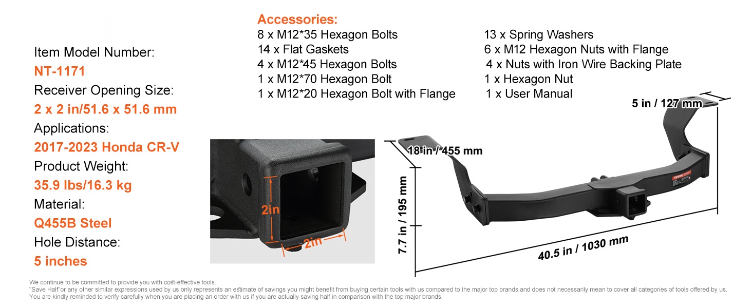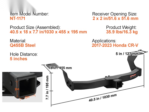 Tämä vetokoukku on mitoitettu tarkasti ajoneuvoon 2017–2023 Honda CR-V. Se kohdistuu auton runkopalkkien reikiin ja istuu tiukasti ilman lisäsovitteita.