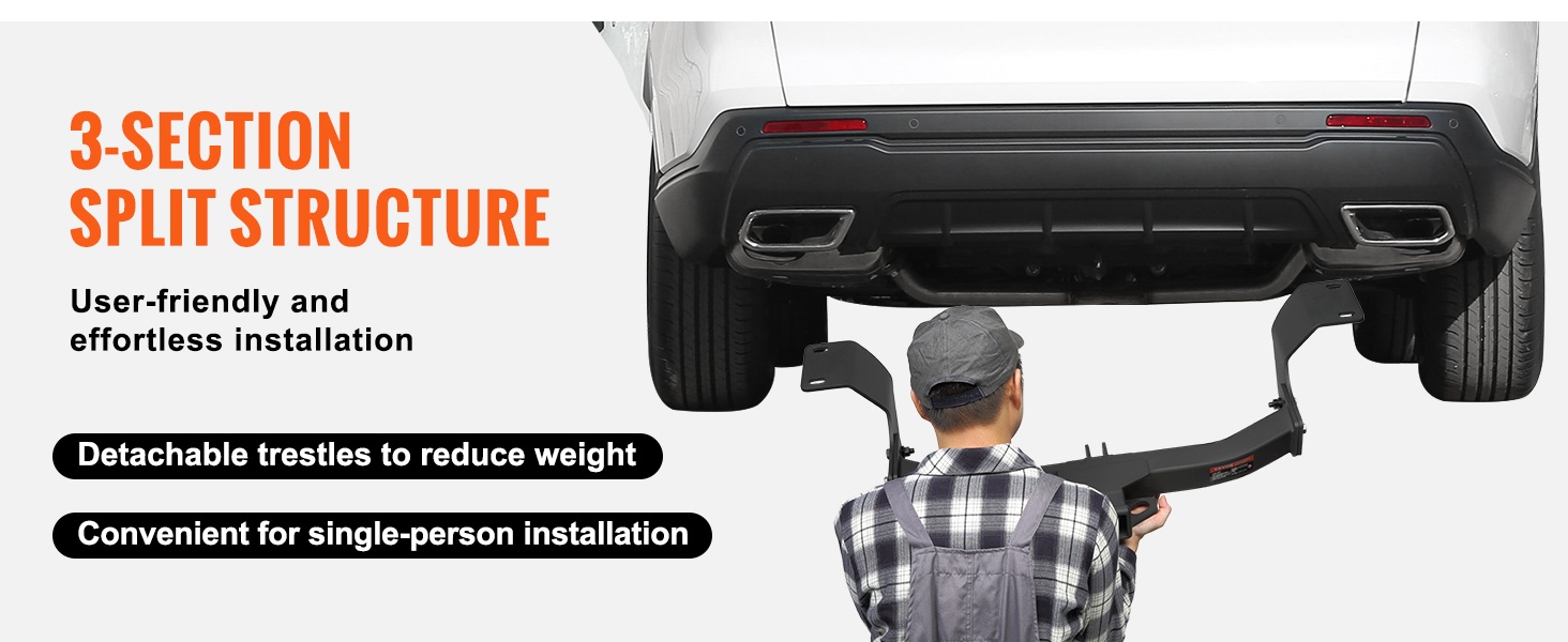 Kolmiosainen rakenne, jossa vasen ja oikea kannatin ovat erillään, helpottaa käsittelyä ja asennusta. Keveämmät osat tekevät vetokoukun yksin asentamisesta sujuvaa.