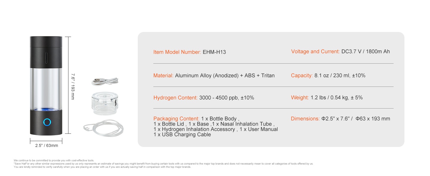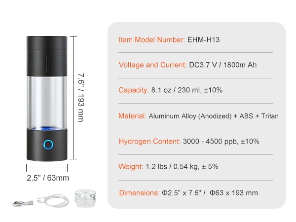Kompakti vedellä täytettävä vetyvesipullo tuottaa nopeasti korkean pitoisuuden vetyä juomaveteen ja mahdollistaa myös vedyn hengittämisen mukana tulevan nenäkanisterin avulla. Laite on suunniteltu jokapäiväiseen käyttöön ja helppoon kuljettamiseen.