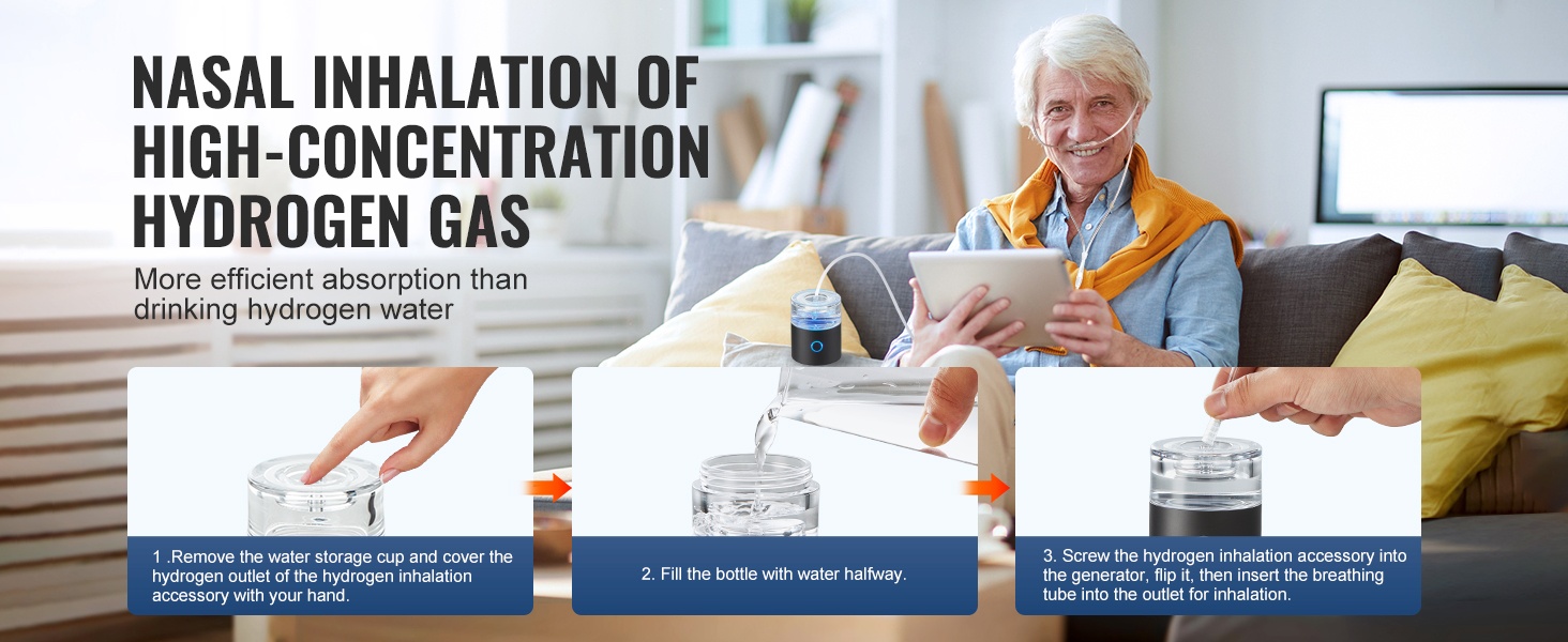 Vetyvesigeneraattorin mukana tulee erillinen vedyn hengityslaite ja nenäinhalointiputki. Tämä helpottaa käyttöä ja lyhentää aikaa, jonka aikana keho voi imeyttää vetykaasua hengityksen kautta.