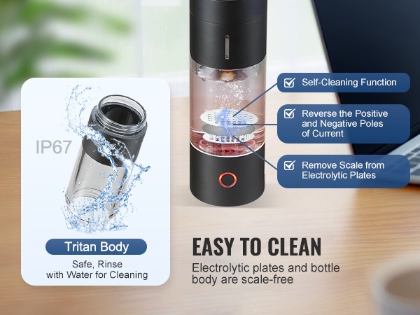 Generaattorissa on itsepuhdistustoiminto, joka auttaa puhdistamaan elektrodilevyihin kertyvää kalkkia. Pullon runko on helppo pitää puhtaana ja se on valmistettu elintarvikelaatuisista, iskunkestävistä materiaaleista.