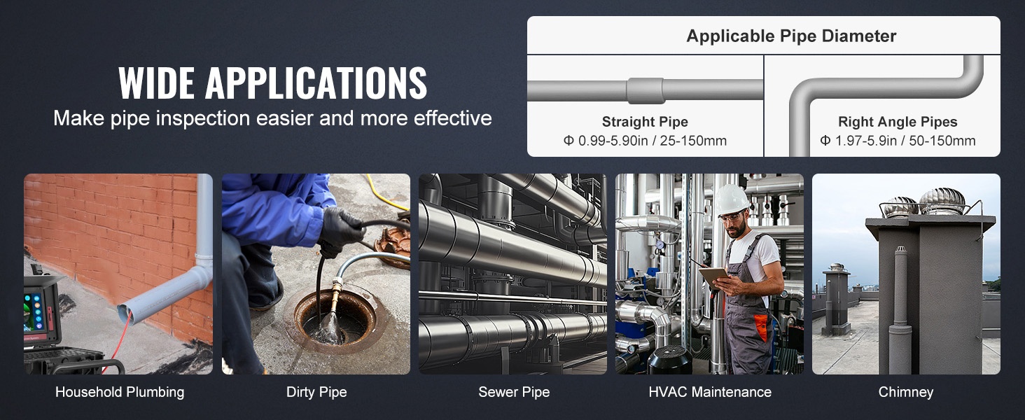 Kamerassa on 6 LED-valoa ja 3-portainen kirkkaudensäätö, joten näet selkeästi myös pimeissä ja sameissa putkissa. 120° laajakulmaobjektiivi kattaa kerralla suuren alueen, mikä helpottaa tarkastusta ja vikojen paikantamista.