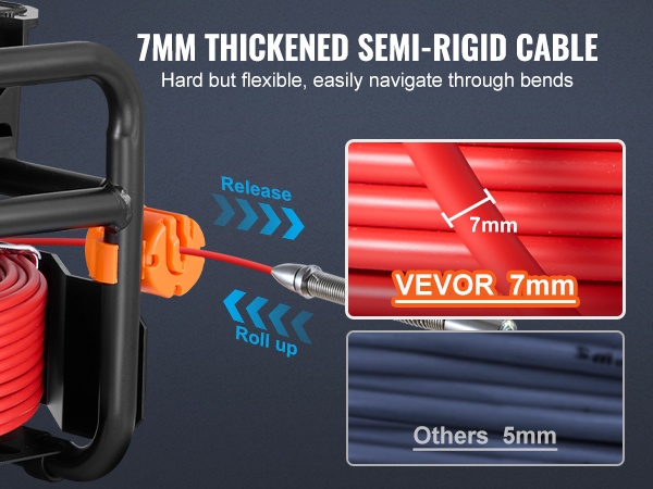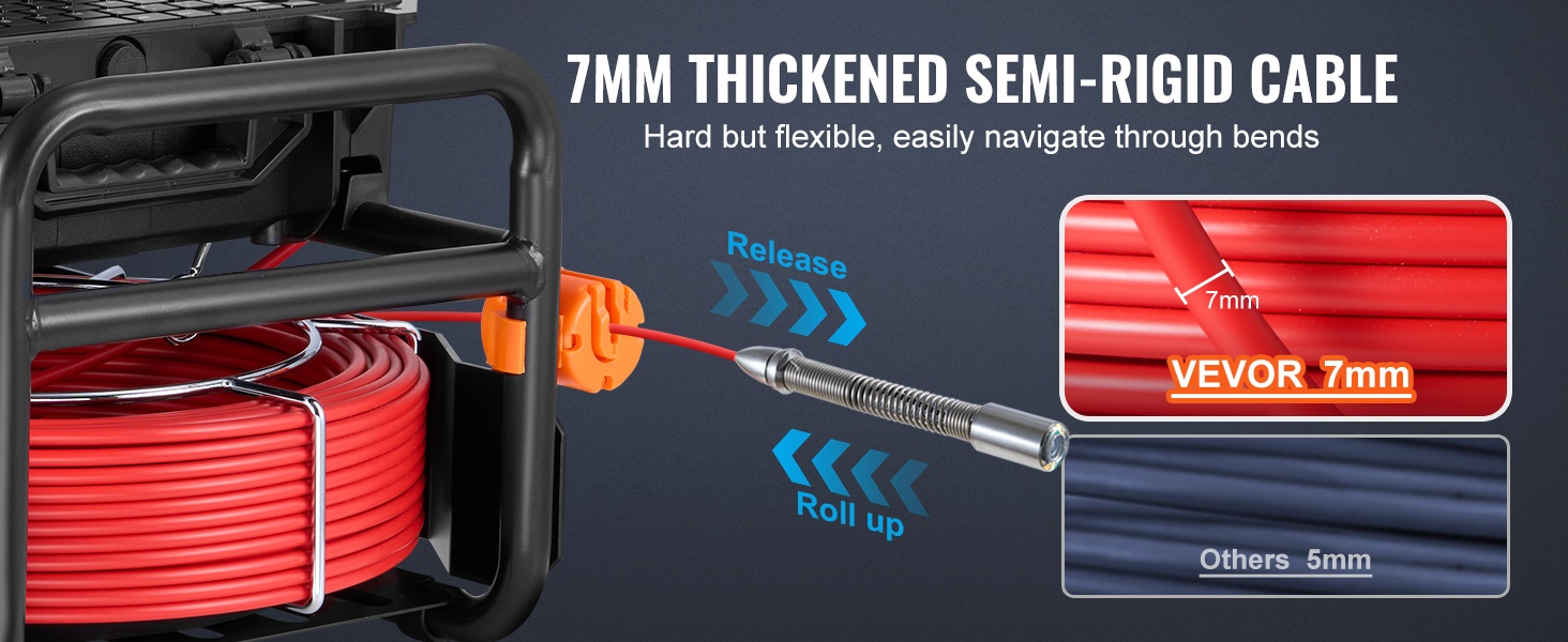 5 mm puolijäykkä kamerakaapeli kulkee sujuvasti putkissa ja mutkissa ja sopii monenlaisiin tarkastustehtäviin. Kaapelikela helpottaa kaapelin hallintaa ja säilytystä, jolloin työskentely pysyy siistinä ja järjestelmällisenä.