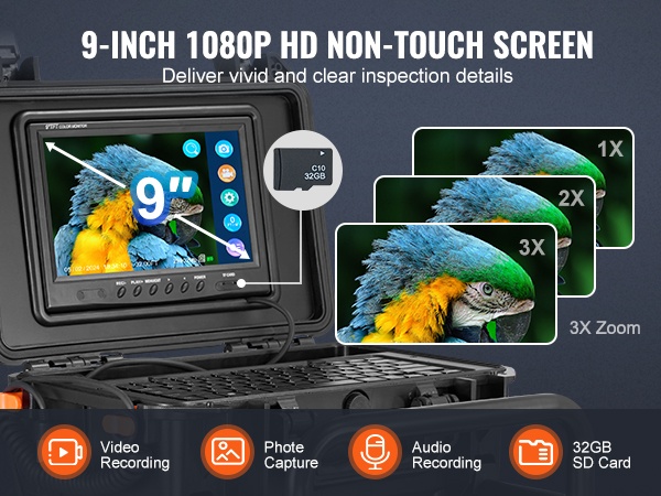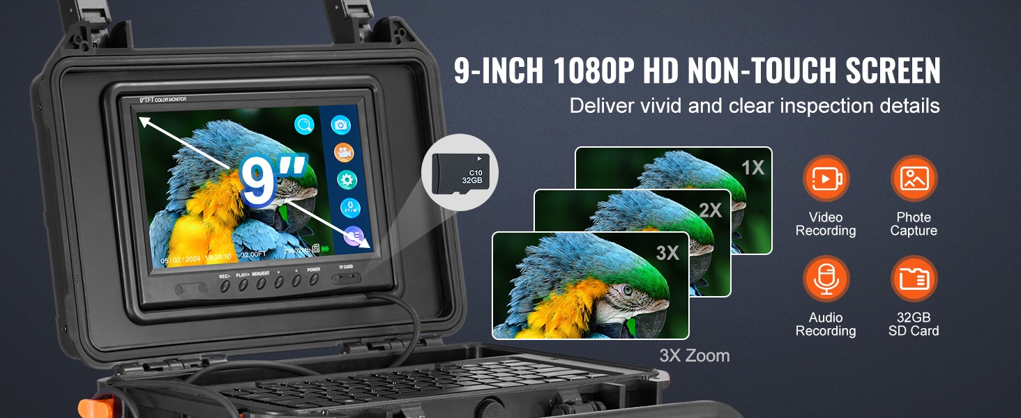 4.3-tuumainen LCD-värinäyttö näyttää tarkat yksityiskohdat putkista ja kanavista. Voit tallentaa sekä videoita että kuvia ja hyödyntää 3x digitaalista zoomia ongelmakohtien tarkempaan tarkasteluun. Mukana tuleva 16GB SD-kortti tarjoaa runsaasti tilaa tallenteille.