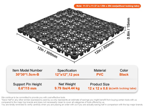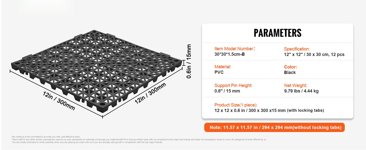 - Tuotteen koko (korkeus mukaan lukien): 12 x 12 x 0.6 inch / 300 x 300 x 15 mm (lukitusliuskojen kanssa)