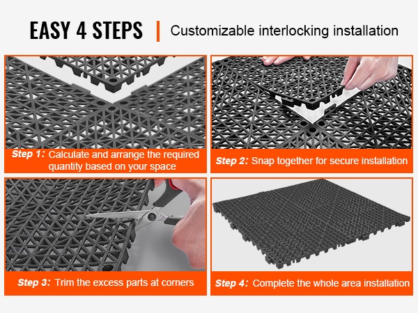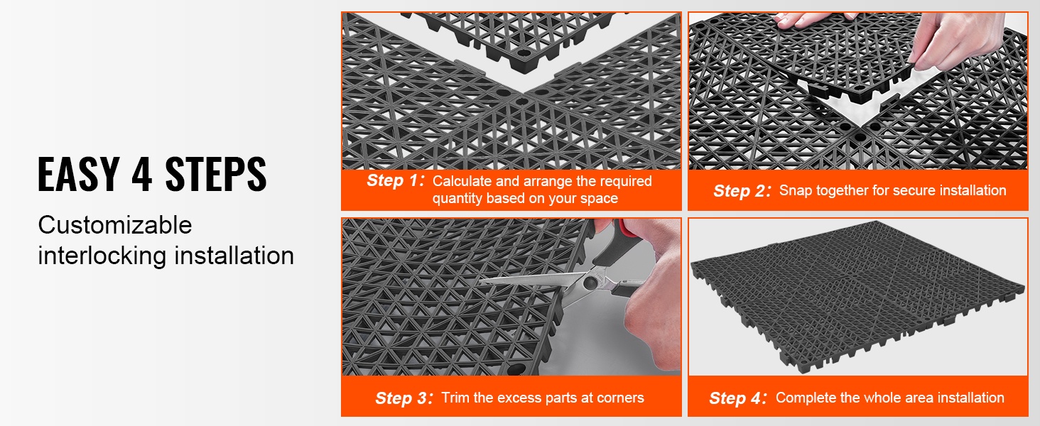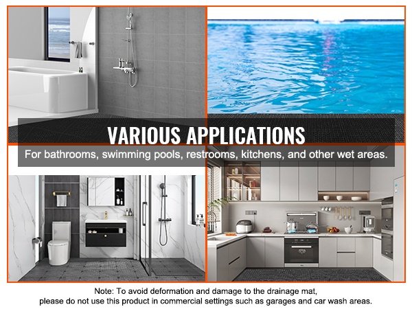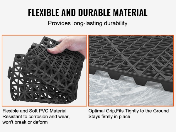 Pidä askeleet vakaana ja lattiat kuivina näillä toisiinsa lukittuvilla PVC-viemäröintilaatoilla. 0,6-tuumaiset (15 mm) korotustapit tehostavat veden poistoa ja vähentävät lammikoiden muodostumista. Laatat tarjoavat hyvän liukuesteen märissäkin tiloissa.