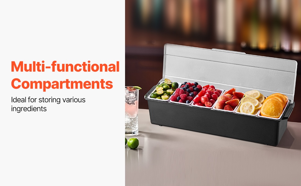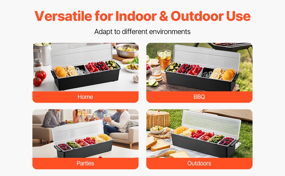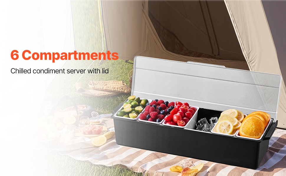 Monikäyttöinen viilennetty lisäkeastia, jossa on 4 erillistä lokeroa. Pohjan jäätila pitää ainekset raikkaana ja sopivan viileänä pitkään – ihanteellinen baariin, juhliin, buffet-pöytään sekä koti- ja ravintolakäyttöön.
