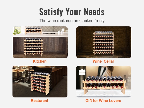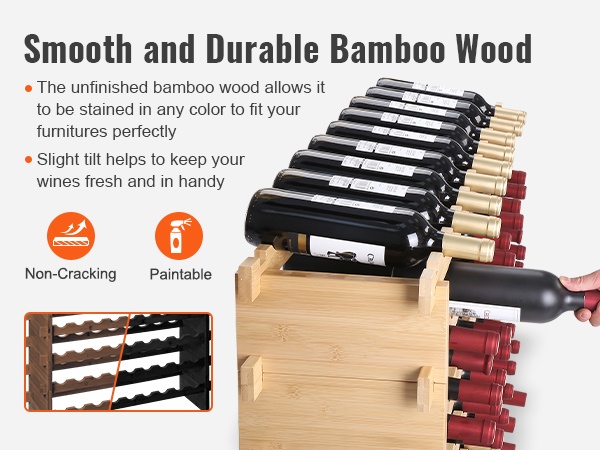 Luonnon bambusta valmistettu 6-tasoinen viiniteline on monikäyttöinen ratkaisu viinipullojen säilytykseen. Se sopii hyvin keittiöön, ruokailutilaan, viinikellariin tai baarin yhteyteen, ja kerroksia voi pinota tarpeen mukaan.