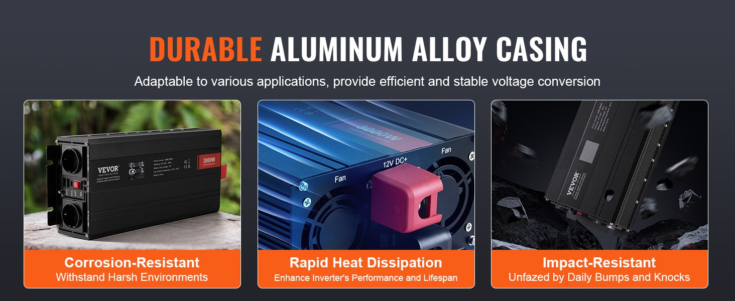 Laite on koteloitu kestävään alumiiniseokseen, joka suojaa korroosiolta ja hapettumiselta sekä parantaa lämmön johtumista. Rakenne tukee luotettavaa ja tasaista virransyöttöä pitkään käytettäessä.