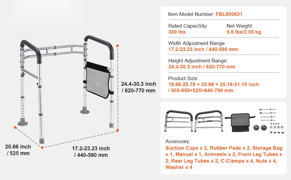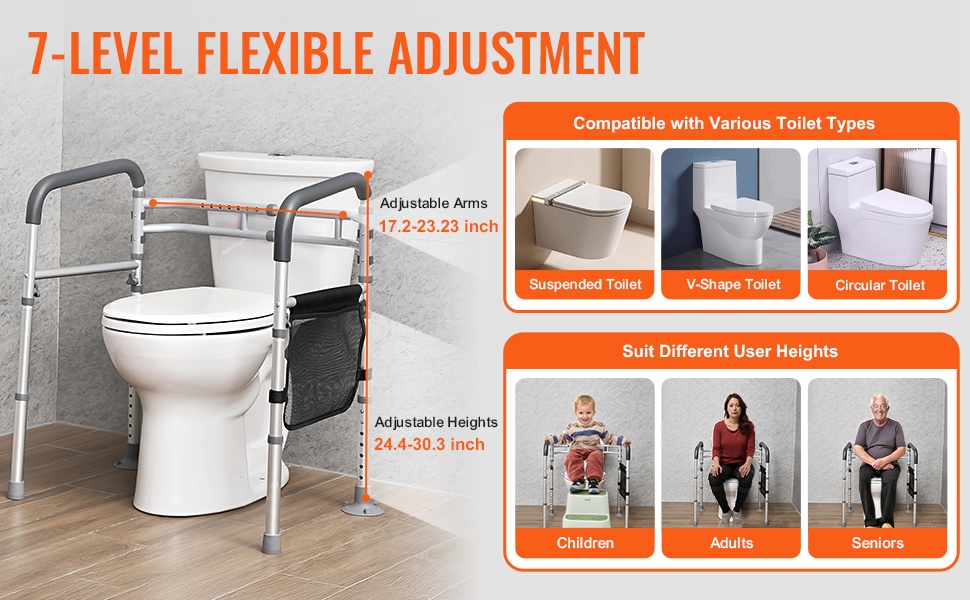 - Säädettävä leveys ja korkeus, yhteensopiva monenlaisten WC-istuinten kanssa