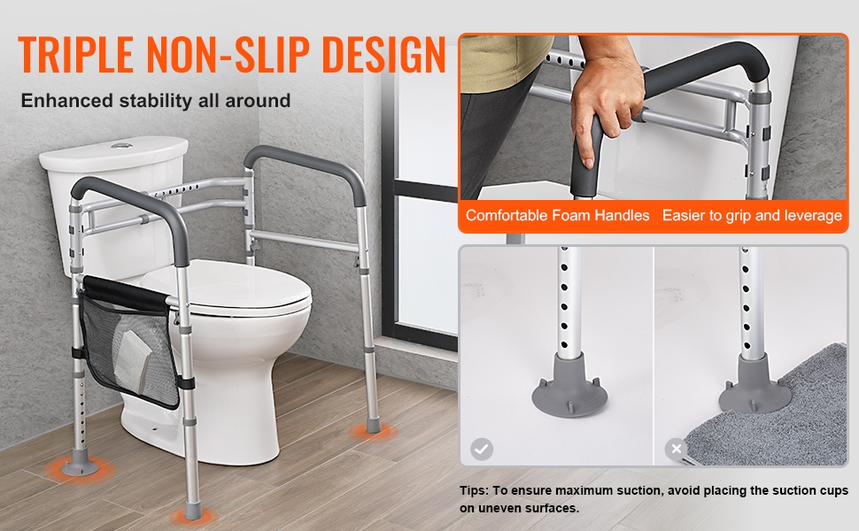 Etujalkojen silikonipäät ja takajalkojen imukupit parantavat pitoa lattiaan ja vähentävät liukastumisriskiä erityisesti kosteissa tiloissa. Pehmeät vaahtomuovikahvat tuntuvat kädessä miellyttäviltä ja auttavat saamaan tukevan otteen ylös noustessa ja istuutuessa.
