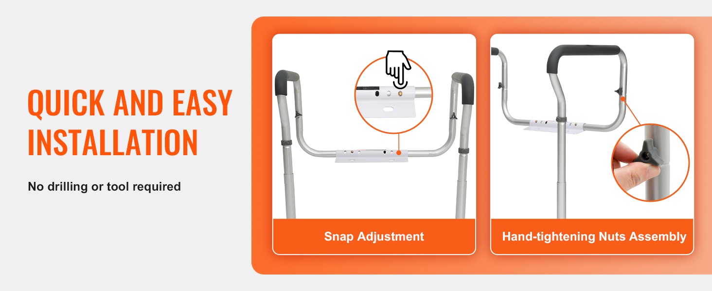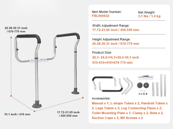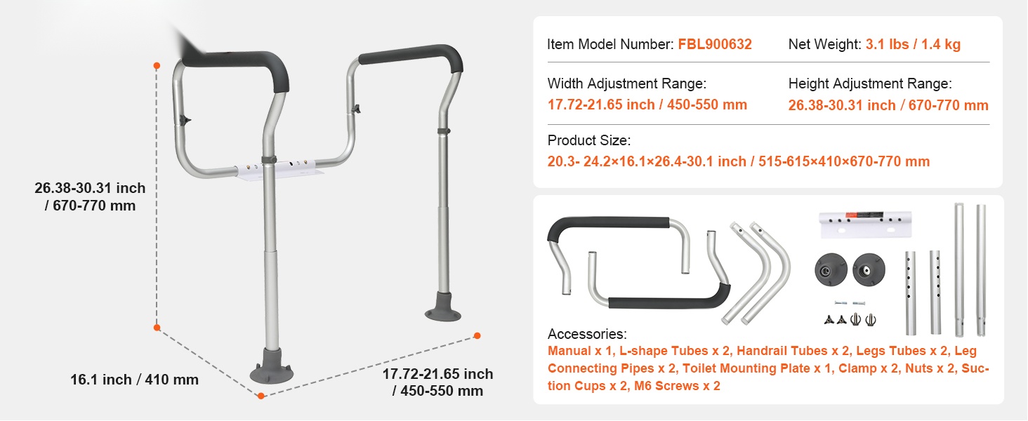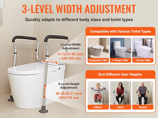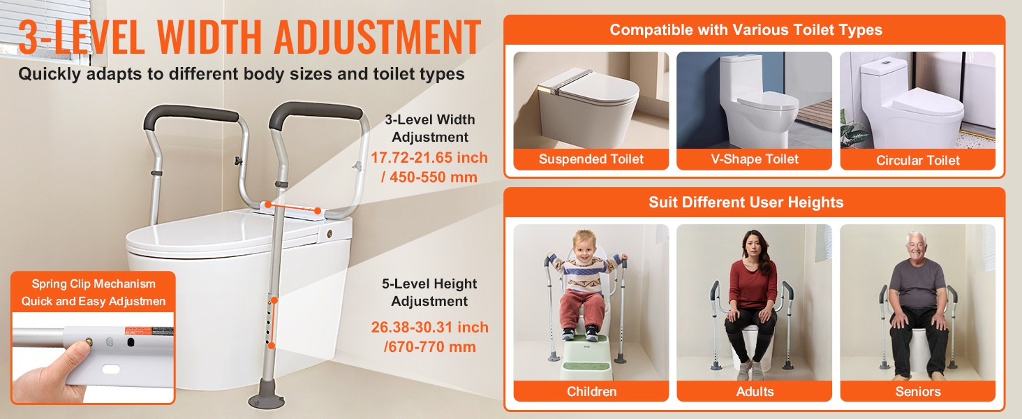 Kaiteessa on 3 leveyssäätöä (17.71–21.65 tuumaa) ja 5 korkeussäätöä (26.37–30.31 tuumaa). Joustava jousinapilla tehtävä säätö mahdollistaa koon helpon mukauttamisen, joten kehikko sopii monen kokoisiin WC-istuimiin.
