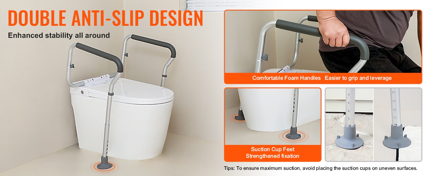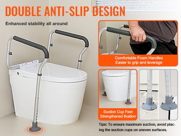 WC-turvakaide alumiiniseosta säädettävä leveys ja korkeus kantavuus 136 kg pehmustetut käsinojat imukuppijalat