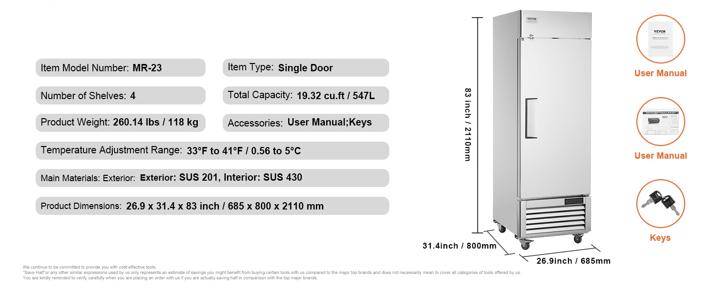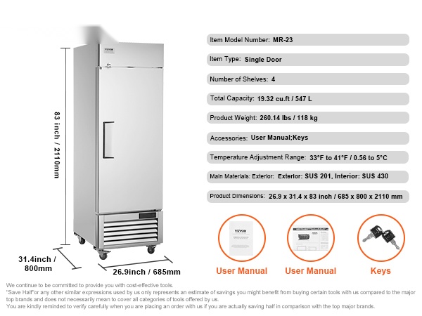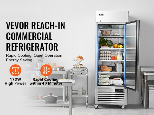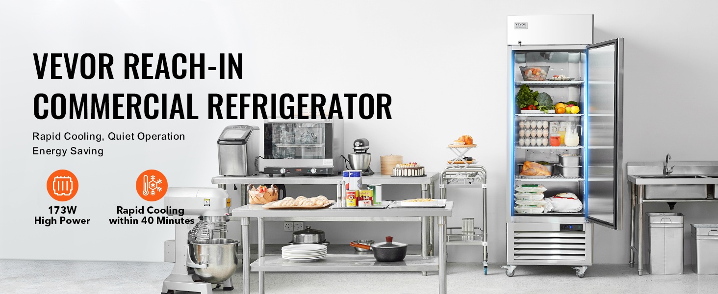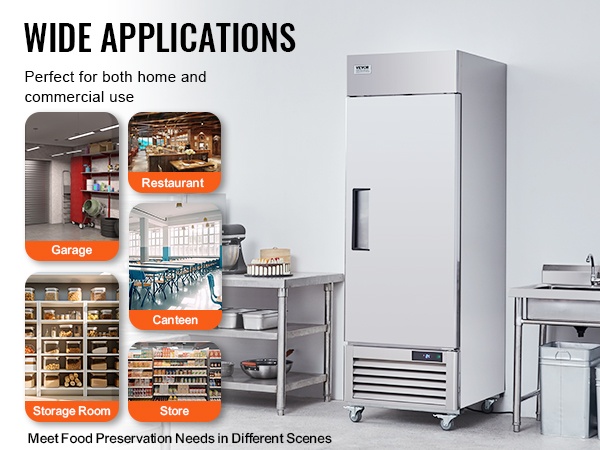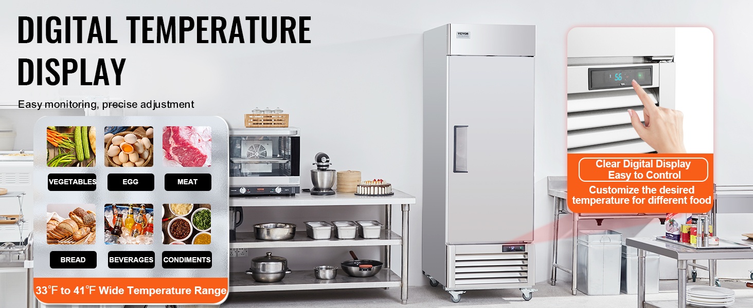 Yhden oven kaupallinen jääkaappi, jonka tilavuus on 20.12 Cu.ft / 570 L. Tehokas kompressorijäähdytys, automaattinen sulatus ja selkeä digitaalinen lämpötilanäyttö pitävät raaka-aineet tasalaatuisen viileinä. Ruostumattomasta teräksestä valmistettu sisä- ja ulkopinta kestää hyvin käyttöä ja on helppo puhdistaa.