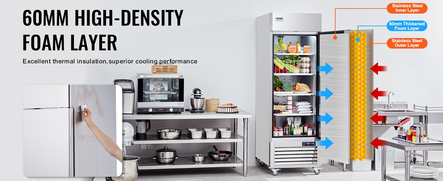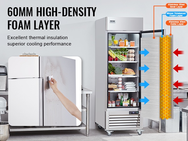 60mm paksu tiheä vaahtomuovieriste varmistaa erinomaisen lämmöneristyksen ja vakaan sisälämpötilan. Ruostumattomasta teräksestä valmistettu sisä- ja ulkopinta lisää kestävyyttä ja auttaa pitämään kylmän ilman tehokkaasti kaapin sisällä, mikä edistää elintarvikkeiden säilyvyyttä.